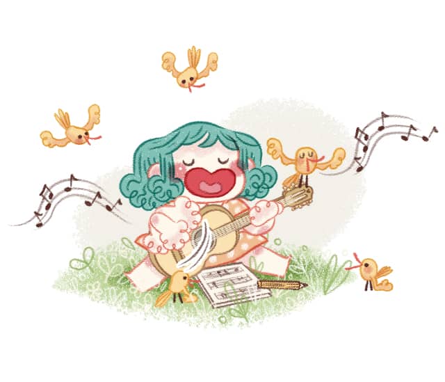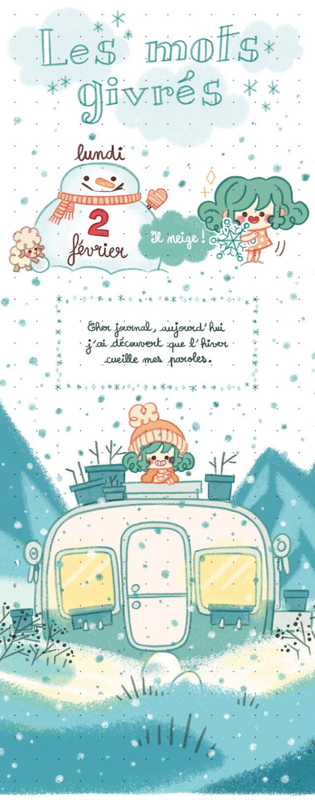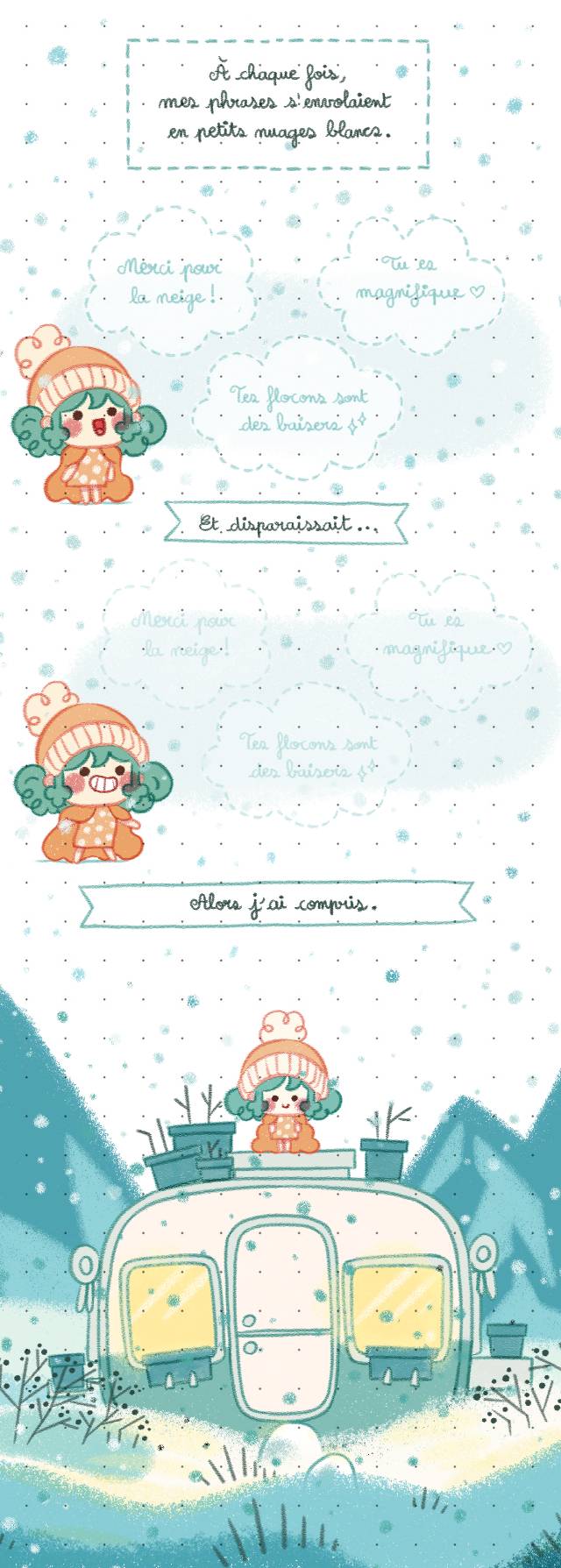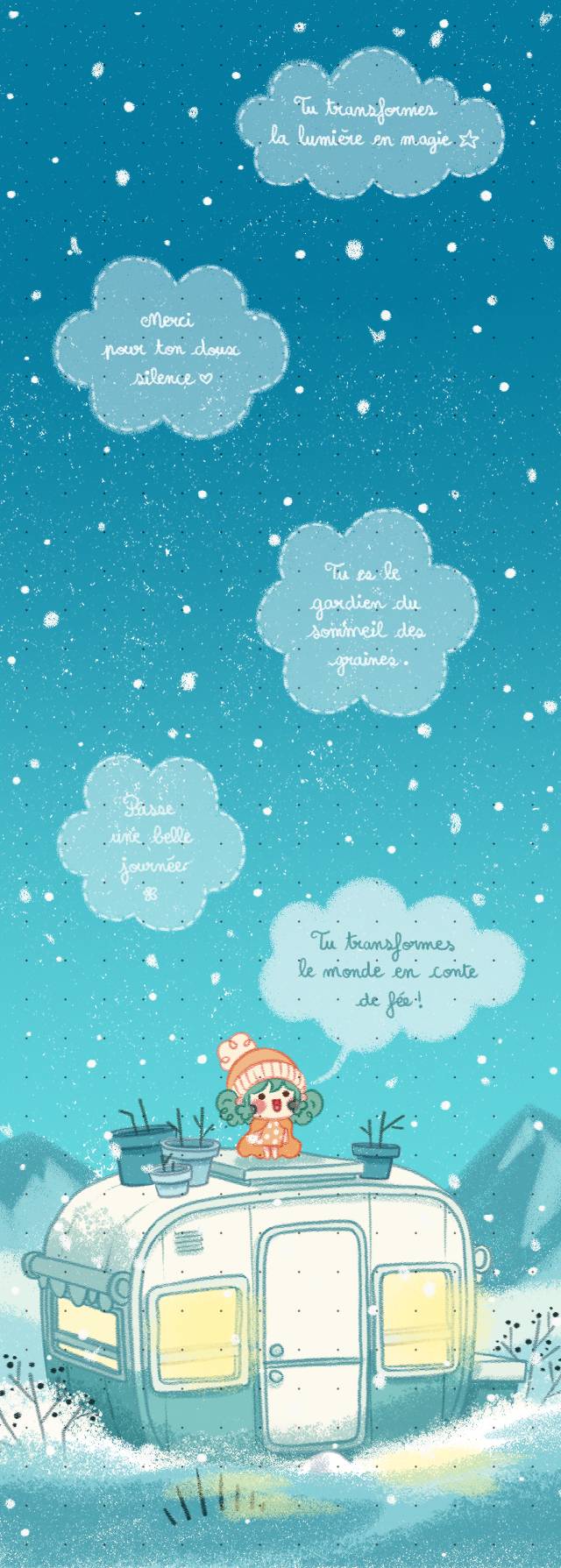 Une série de 4 tomes qui raconte les aventures d'une fillette aux cheveux bleus vivant sur l'Île-aux-Épinettes, dans un univers de cozy-fantasy poétique.